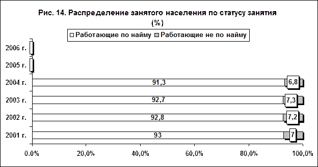 Рис. 9. Структура занятости По современному российскому законодательству (Закон «О занятости населения в РФ»), занятость – «это деятельность граждан, связанная с удовлетворением личных и общественных потребностей, не противоречащая законодательству и приносящая, как правило, им заработок (трудовой доход)». Соответственно, изменяется и трактовка полной занятости. Она сближается с международной практикой, где оценивается как совпадение спроса и предложения на рабочую силу. Занятость – система отношений, отражающих условия создания рабочих мест и распределения работников по рабочим местам. Эти отношения между работодателем и работополучателем охватывают условия продажи рабочей силы и предоставления работнику соответствующей профессии и квалификации рабочего места с установленным уровнем оплаты труда и предоставлением определенных социальных льгот, определенных условий труда, режима труда и отдыха, возможностей обучения, повышения квалификации и переподготовки, перспективами профессионального роста и соблюдением законодательства. Задание 1.5.2. Проанализируйте приведенные ниже данные федеральной статистики, определите основные тенденции. Проведите аналогичный анализ применительно к исследуемой вами территории. Используйте результаты анализа при подготовке самостоятельной (контрольной) работы!!!