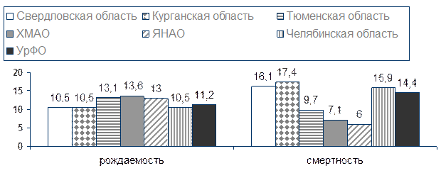 Рис. 28. Демографическая ситуация в субъектах РФ в УрФО (на 1000 жителей) 1 полугодие 2006 г.