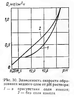 Составы растворов химического меднения Растворы химического меднения могут быть концентрированные (быстрого действия) и некоццеитрированные (медленного действия). Концентрация солей двухвалентной меди, входящих в состав расвора, обеспечивает нужную скорость меднения. Основным восстановителем является формальдегид, восстанавливающий медь на холоду. Как показывают исследования, скорость восстановления меди увеличивается с увеличением концентрации формальдегида, причем увеличение более значительно при небольших концентрациях СН2О. Кроме того, чем выше в растворе концентрация ионов меди, тем сильнее влияние концентрации формальде-гида на скорость процесса мед-нения. В качестве восстановителей можно применять гипофосфит и гидразин, но они менее удобны, так как их восстановительные свойства проявляются лишь при повышенной температуре. Важно учитывать рН раствора. Растворы, в которых Cu(II) восстанавливается гипофосфитом или гидросульфитом, являются обычно кислыми. Гидразин и формальдегид восстанавливают медь в щелочной среде. Восстанавливающая способность формальдегида увеличивается с повышением щелочности среды. Восстановление Сu (II) фор-мальдегидом начинается лишь при рН> 11 и скорость восста-новления увеличивается с повышением рН (рис. 1) Величина рН неконцентрированных растворов меднения обычно не ниже 12, 0, а концентрированных может быть 11, 5.