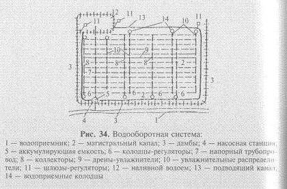 В связи с необходимостью рационально использовать водные ресурсы на польдерах и осушительно-увлажнительных системах создаются водооборотные системы. Они позволяют многократно использовать воды без сброса в транзитные водоприемники. Водооборотная осушительно-увлажнительная система включает в себя два водоема-накопителя (рис. 34). Один — в нижней части магистрального канала мы сбора дренажного стока и второй — в верхней части системы, куда собранный дренажный сток из нижнего водоема подается насосной станцией по напорному трубопроводу. Нижний пруд-накопитель проектируют в наиболее пониженной части системы, верхний — на высоких гипсометрических уровнях с тем, чтобы обеспечить самотечную подачу воды в увлажнительную сеть. Нередко верхний пруд-накопитель приходится ограничивать дамбами.