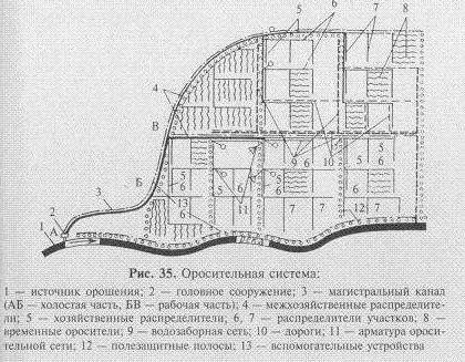 Основные требования, предъявляемые к воде для орошения: она должна быть по качеству пригодной для питания сельскохозяйствен ных культур; запасы и расходы ее в водоисточнике должны удовлетворять потребностям растений в воде в установленные сроки расчетной обеспеченности; водоисточник должен располагаться вблизи орошаемого массива, определяя наименьшие капитальные и эксплуатационные затраты. Исключение может быть в том случае, когда соображениям экологической безопасности или целесообразно приоритет может быть отдан более дальним водозаборам. Основная задача оросительных мелиорации — обеспечение обходимого водно-воздушного, теплового и питательного режимов почв на территориях, испытывающих недостаток влаги. Оросительные мелиорации классифицируют по трем основный признакам: » времени действия; » способу проведения; » цели орошения. По времени действия выделяется: а) регулярно действующее орошение (самотечное или с механическим водоподъемом); б) однократно действующие — паводковое и лиманное орошение. По способу проведения орошение делится на: а) распределение воды по поверхнсти почвы (поверхностный полив по бороздам, полосам или путем затопления отдельных участков); б) распыление воды в воздухе при помощи дождевальных установок, увлажняющих не только почву, но и растения и приземный слой воздуха; в) подпочвенное орошение ну тем подачи воды по дренам. Кроме увлажнительного орошения, широко распространены специальные виды, которые имеют узкоцелевое назначение. Среди них наиболее известны: а) удобрительное орошение, имеющее целью снабжение почвы и растений растворенными в воде питательными веществами; и) сточные воды; в) почвоочищающее (дезинфекционное) орошение, цель которого очистить почву от избыточных солей в почве и от вредителей растений; г) окислительное орошение, проводимое для окисления и заиления осушенных ранее заболоченных почв речными водами; д) отеплительное орошение водой, особо эффективное при борьбе с заморозками и удлиняющее вегетационный период; е) освежительное орошение, осуществляемое при помощи дождевальных машин и предназначенное для повышения влажности почв и приземного слоя воздуха, в результате чего возрастают затраты тепла на испарение и снижаются затраты энергии ни на турбулентный теплообмен между поверхностью почвы и атмосферой, что приводит к снижению температуры воздуха на 2—5°. Оросительная система представляет собой комплекс сооружений, подающий воду на поля в необходимое время и в нужном объеме. 11остоянно действующая оросительная система состоит из следующих элементов (рис. 35):