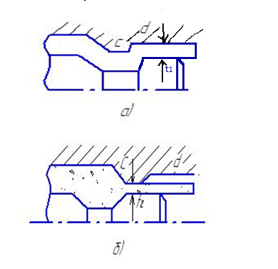 Рис.6 Бурильная труба Задача- получить утолщение на концах. Замки стальные. В начальный момент прессовая игла выдвигается и работает калибрующая часть матрицы – (d). За счет угла наклона материал заполняет полость. После прессования игла перемещается в (б) и работает в качестве калибрующего пояска матрица -(с) и изделие имеет переменного сечения по длине, как по наружной поверхности, так и по внутренней.