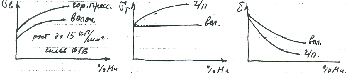 Рис. 29 Влияние пресс-эффекта на механические свойства Основная причина повышения прочности заключается в том, что температура рекристаллизации упрочняемых алюминевых сплавов, подвергнутых прессованию, больше температуры нагрева под закалку. В этом случае пресс-изделия после окончательной термообработки имеют нерекристаллизованную структуру, что и обуславливает его повышенную прочность. Возникновению пресс-эффекта способствует наличие в сплавах марганца, циркония, хрома.