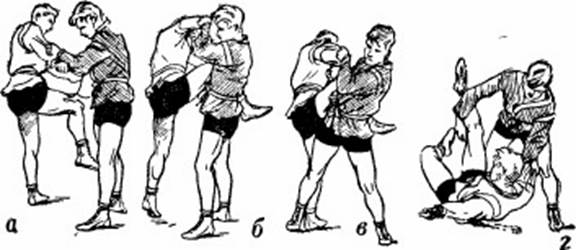 Приемы против захвата одной ноги. Если противник захватывает вашу правую ногу снаружи за подколенный сгиб, упритесь подъемом этой ноги во внутреннюю часть левого бедра противника и захватите правой рукой пояс на его спине через плечо. Прижимаясь грудью к верхней части спины противника, проводите бросок через голову с подсадом голенью.