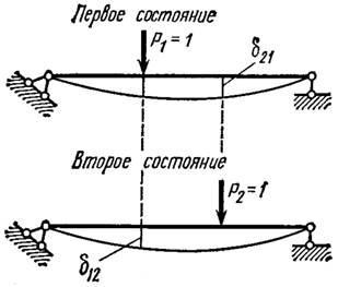 Рассмотрим два состояния системы. В первом состоянии к системе приложена сила Р1=1, во втором сила Р2=1. Обозначим перемещения, вызванные единичными силами знаком δ. В соответствии с этим перемещение рассматриваемой системы по направлению силы Р2=1 в первом состоянии (т.е. вызванное силой Р1=1) обозначим δ 21, а перемещение по направлению силы Р1=1 во втором состоянии обозначим δ 12.