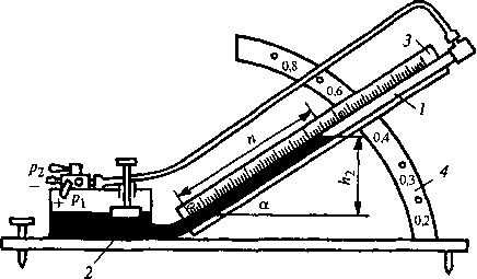 В жидкостных манометрах функции чувствительного элемента выполняет рабочая жидкость (вода, ртуть, спирт, масло), входной величиной является давление или разность давлений, выходной - уровень рабочей жидкости, по положению которого и определяется значение измеряемого давления или разность давлений. Большинство жидкостных манометров имеют непосредственно видимый уровень рабочей жидкости, но существует группа жидкостных манометров, в которых уровень рабочей жидкости не наблюдается, а вызывает перемещение поплавка или изменение характеристик другого устройства, обеспечивающих либо непосредственное показание измеряемой величины с помощью отсчетного устройства, либо преобразование и передачу ее значения на расстояние. В жидкостных двухтрубных манометрах две вертикальные сообщающиеся стеклянные трубки 1, закреплены на металлическом или деревянном основании 3, к которому прикреплена шкальная пластинка 4.