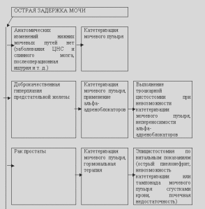 Самые распространенные причины задержки мочи у мужчин 1. Механические нарушения обусловлены отсутствием нормальной работы нервной системы, из-за чего происходит неадекватная работа мышц сфинктера – они слишком расслаблены или, наоборот, напряжены. Соответственно, в первом случае наступает недержание мочи, а во втором – ее задержка. 2. Неврологические заболевания. Сюда можно отнести такие патологии, как поврежденный спинной мозг, болезни нервной системы. Это может негативно сказываться на выведении мочи из организма из-за того, что повреждены нервы или их пути. 3. Состояния, которые способны повредить нервы и нервные пути: родовая деятельность, инфекционные заболевания мозга, диабет, инсульты, травмы и так далее. 4. Увеличенная простата. Этот орган растет по мере того, как взрослеет мужчина. При этом, если происходит гиперплазия, железа сдавливает мочеиспускательный канал и в конце концов начинается задержка. 5. Инфекции мочевыводящих путей. Из-за инфицирования начинаются отеки, раздражение и воспаления тканей, это приводит к задержке мочи. 6. Прием лекарственных препаратов. Есть препараты, которые специалисты назначают, чтобы замедлить передачу нервных импульсов. Такие препараты также могут негативно сказываться на выведении мочи из организма. 7. Мочекаменная болезнь. Часто причиной задержки мочи становится камень в мочевике. Струя останавливается внезапно, часто рецидивируют циститы, что еще больше усугубляет заболевание. 8. Стриктура уретры. При этом заболевании сужается просвет уретры из-за рубцов, которые возникают в результате инфекций, травм, операций. Из-за такого сужения не возможен нормальный отток мочи.