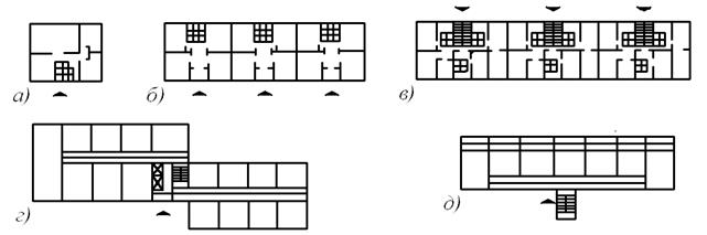 Рис. 2.2. Схемы объемно-планировочных решений жилых зданий: а – одноквартирных; б – блокированных; в – секционных; г – коридорных; д – галерейных; Коридорные дома являются одним из типов многоквартирных домов, сочетающих вертикальные и горизонтальные коммуникационные помещения (рис. 2.2, г). Коридоры соединяют квартиры с лестницами и лифтами и позволяют увеличить число квартир, обслуживаемых одним лестнично-лифтовым узлом. Однако протяженность коридоров ограничивается требованием их естественной освещенности и должна быть не более 48 м при освещении с двух сторон и до 24 м при освещении с одной стороны. Галерейными называются многоквартирные дома, сочетающие вертикальные (закрытые или открытые) коммуникационные помещения с открытыми горизонтальными галереями (рис. 2.2, д). По благоустройству квартир жилые здания проектируют: с полным инженерным решением (лифт, мусоропровод, водоснабжение, канализация, газоснабжение, теплоснабжение, слаботочные сети и т.д.); с неполным инженерным оборудованием (водопровод, печное отопление и газ). В квартирных жилых домах основным элементом является квартира, предназначенная для одной семьи. Каждая квартира должна состоять из набора помещений: жилых (общие комнаты, спальни), подсобных (кухня, передняя, туалет, ванная, встроенные шкафы и т.д.), летних (веранда, лоджия, балкон). Сумма площадей жилых и подсобных комнат называется общей площадью квартиры. Размеры всех комнат, их взаиморасположение и конструктивные решения определяются в зависимости от предполагаемого потребителя (тип семьи, состав, возраст, пол членов семьи) и в соответствии с требованиями СНиП 31-01-2003 [12].