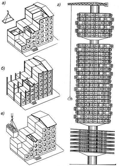 Рис. 3.2. Основные конструктивные системы зданий: а – стеновая; б – каркасная; в – объемно-блочная; г – ствольная