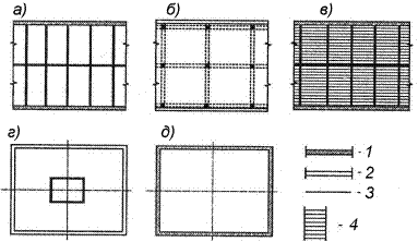Рис. 3.3. Схема размещения несущих и ограждающих элементов в плане основных конструктивных систем: а – стеновая; б – каркасная; в – объемно-блочная; г – ствольная; д – оболочковая: 1 – несущая внешняя стена; 2 – ненесущие стены; 3 – внутренняя несущая конструкция; 4 – несущий объемный блок
