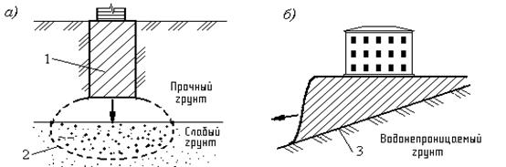 Основанием называется массив грунта, испытывающий давление от возведенного здания или сооружения. Надежность основания является важнейшим условием, обеспечивающим прочность и устойчивость любого здания или сооружения. Основания подразделяются на естественные и искусственные. Естественными основаниями являются грунты, способные в своем природном состоянии выдержать нагрузку от возведенного здания. Грунты, расположенные в основании, должны удовлетворять следующим требованиям: - обладать достаточной несущей способностью, а также малой и равномерной сжимаемостью. Слабые и неравномерно сжимаемые грунты вызывают большие и неравномерные осадки здания, приводящие к его повреждению и даже разрушению; - не подвергаться пучению, т.е. увеличению объема при замерзании влаги, находящейся в порах грунта; - не размываться и не растворяться грунтовыми водами; - не допускать просадок и оползней. Просадки могут произойти при недостаточной мощности слоя грунта, принятого за основание, если под ними располагается слабый грунт (рис. 4.1, а). Оползни могут иметь место при наклонном расположении пластов грунта, ограниченных крутым откосом или косогором (рис. 4.1, б).