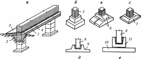 Рис. 4.4. Столбчатые фундаменты: а – под наружные стены; б – монолитные под столбы; в, г – из железобетонного блока-подушки и блока плиты; д – из железобетонного башмака стаканного типа; е – из железобетонного блока-стакана и опорной плиты: 1 – железобетонная фундаментная балка; 2 – подсыпка; 3 – отмостка; 4 – гидроизоляция; 5 – кирпичный столб; 6 – блоки-подушки; 7 – железобетонная плита; 8 – железобетонная колонна; 9 – башмак стаканного типа; 10 – плита под башмак; 11 – блок-стакан По конструктивному решению столбчатые фундаменты могут быть монолитными, возводимыми на месте строительства в опалубке, и сборными, изготовленными на заводе. Под кирпичные столбы фундаменты выполняют из железобетонных плит, уложенных одна на другую, или в виде ступенчатых опор из природного камня. Столбчатые фундаменты под несущими стенами здания устанавливают в углах, в местах примыкания и пересечения стен, а на протяженных участках – через 3–6 м. Поверх опор столбчатых фундаментов укладывают железобетонные балки, передающие нагрузку от стен на фундаменты. Сборные фундаменты устанавливают на песчаную подушку толщиной 0, 1–0, 15 м. На пучинистых грунтах под фундаментную балку устраивают слой песка или сыпучего утеплителя (керамзита или шлака) толщиной 0, 5–0, 6 м. Ленточные фундаменты представляют собой конструкцию, являющуюся продолжением несущих стен здания и располагаемых по всей длине наружных и внутренних несущих стен. В отдельных случаях такие фундаменты могут располагаться и под рядами колонн. Ленточные фундаменты в поперечном сечении бывают прямоугольными, трапецеидальными, ступенчатыми, прямоугольными с подушкой (рис. 4.5). Ленточные фундаменты передают нагрузку на основание равномерно, что особенно важно при слабых и неоднородных по сжимаемости грунтах, а также просадочных макропористых грунтах. В Западной Сибири такой вид фундамента является наиболее широко применяемым для малоэтажных зданий.