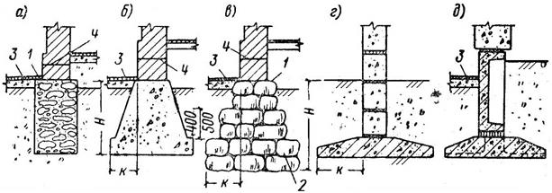 Рис. 4.5. Ленточные фундаменты: а – бутобетонные прямоугольные; б – бетонные трапецеидальной формы; в – бутовый ступенчатый; г – сборный железобетонный из блоков; д – то же из крупных панелей: 1 – обрез; 2 – уступ; 3 – отмостка; 4 – гидроизоляция Ширину подошвы фундамента определяют расчетом, ширина поверху должна быть больше ширины стены на 10–12 см, необходимо также с каждой стороны оставлять обрезы. Трапеция является оптимальной теоретической формой поперечного сечения фундамента с уширенной подошвой. При пологом наклоне граней в теле трапецеидального фундамента возникают большие растягивающие и скалывающие напряжения, которые приводят к образованию трещин. Поэтому при применении для фундамента бута, бутобетона и бетона – материалов, слабо сопротивляющихся изгибу, устраивают жесткие фундаменты, в которых соотношения Н: К для бутовой кладки и бутобетона должно составлять 1, 5–2, 0, для бетона 1, 35–1, 75. Если требуется заложить ленточный фундамент небольшой глубины с уширенной подошвой, применяют железобетонные гибкие фундаменты. Железобетонные фундаменты могут быть как монолитного, так и сборного варианта. В обоих случаях производится расчет на прогиб подушки, в которой устраивается арматурная сетка. Наиболее индустриальными и прогрессивными являются сборные фундаменты. Сборные ленточные фундаменты обычно выполняют из железобетонных блоков-подушек и вертикальных стенок заводского изготовления (рис. 4.6). Вертикальная стенка может быть выполнена из сплошных или пустотелых блоков, рам или панелей. При таком способе производства работ снижаются трудовые затраты, облегчается работа в зимнее время. Блоки-подушки укладываются непосредственно на выровненную поверхность грунта основания или на песчаную подготовку толщиной 100–150 мм. Фундаментные бетонные блоки укладываются на растворе с обязательной перевязкой вертикальных швов. Толщина швов принимается равной 20 мм, вертикальные колодцы, образующиеся торцами блоков, тщательно заполняются раствором. Связь между сборными фундаментами продольных и поперечных стен осуществляется перевязкой блоков и закладкой в горизонтальные швы арматурных стальных сеток. Сборные ленточные фундаменты в соответствии с расчетом необходимой площади могут устраиваться непрерывными, прерывистыми и без подушек. Последние два варианта дают экономию в материалах за счет снижения затрат на блоки-подушки. При необходимости обеспечить независимую осадку двух несмежных участков здания устраивают осадочные швы, т.е. сквозные зазоры. Для беспрепятственной осадки в зазоры вставляют доски, обернутые толем, заполняют битумом или другим органическим вяжущим.