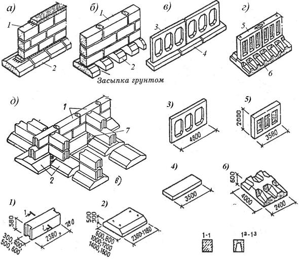 Рис. 4.6. Сборные железобетонные ленточные фундаменты: а – из крупных блоков; б – то же с прерывистой подушкой; в – рамный; г – панельный; д – схема соединения элементов: 1 – бетонные блоки; 2, 4 – фундаментные подушки; 3 – рамы; 5 – панели; 6 – фундаментные ребристые плиты; 7 – соединения из монолитного бетона
