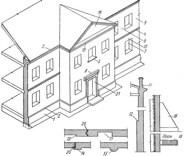 Рис. 4.11. Архитектурно-конструктивные элементы стен: 1 – цоколь; 2 – кордон; 3 – главный карниз; 4 – промежуточный карниз; 5 – подоконный поясок; 6 – сандрик; 7 – оконный проем; 8 – простенок рядовой; 9 – простенок угловой; 10 – перемычка; 11 – ниша; 12 – обрез стены; 13 – раскреповка; 14 – пилястра; 15 – полуколонна; 16 – контрфорс; 17 – парапет; 18 – фронтон; 19 – горизонтальный карниз фронтона; 20 – деформационный шов; 21 – дверной проем Цоколь – нижняя, обычно утолщенная, надземная часть наружной стены, защищающая ее от увлажнения и случайных механических повреждений. Цоколь является важным архитектурным элементом: образуя основу здания, придает ему зрительно и конструктивно большую устойчивость. Карнизы – верхние горизонтальные профилированные выступы, предназначенные для предохранения стен от увлажнения стекающей с крыши дождевой или талой водой. Кроме венчающего, часто устраивают промежуточные карнизы, которые делят фасад по горизонтали. С той же целью над окнами устраивают небольшие карнизы, называемые сандриками, а по плоскости стены – пояски, напоминающие ленты, горизонтально вытянутые по стене. Проемы – крупные отверстия, оставляемые при сооружении стен для окон, дверей или печей. Участки стен между проемами называют простенками. Различают простенки рядовые (между двумя проемами) и угловые (между углами здания и ближайшим проемом). Откосы (притолоки) – верхние и боковые плоскости, ограничивающие проем. В проемах наружных стен откосы обычно делают с четвертями – прямоугольными выступами, закрывающими (для уменьшения продуваемости) щели между притолоками и устанавливаемыми в проем оконными или дверными коробками. Перемычки – конструкции, перекрывающие проемы сверху. Различают перемычки несущие и ненесущие. Несущей называют перемычку, которая, кроме собственного веса и вышележащей кладки, несет нагрузку от элементов перекрытия или других конструкций. Ненесущая перемычка, кроме веса кладки и собственного, никаких нагрузок не несет. Иногда согласно конструкции предусмотрено утолщение стен нижележащих этажей. Образовавшиеся горизонтальные уступы называют обрезами, вертикальные – раскреповками. Пилястры – узкие вертикальные выступы стен прямоугольного сечения, служащие для местного их усиления, а также для придания устойчивости высоким и протяженным стенам. Выступы полукруглого сечения называются полуколоннами. Важной конструктивной деталью являются деформационные швы (температурные и осадочные). Температурные швы разрезают стену от верха до фундамента на отдельные участки. Швы необходимы в стенах большой длины для предотвращения появления трещин из-за деформации материала при колебании температуры. Осадочные швы разрезают фундаменты, стены, перекрытия и покрытия. Устраивают их обычно на площадках с неоднородным грунтом, где возможна неравномерная осадка по периметру фундамента, а также при передаче на грунт неодинаковых нагрузок от отдельных частей здания. Парапет – элемент, являющийся продолжением наружной стены и выступающий над свесом крыши. Парапет препятствует открытому сбросу талой и дождевой воды по поверхности стен, поэтому в здании должны быть предусмотрены дополнительные, внутренние водоотводы. Все это повышает стоимость строительства, поэтому часто парапеты заменяют более простыми и легким
