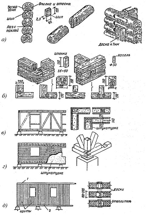 Рис. 4.13. Деревянные стены и их элементы: а – бревенчатые (рубленые); б – брусчатые; в и г – каркасные; д – щитовые: 1 – верхняя обвязка; 2 – нижняя (цокольная) обвязка