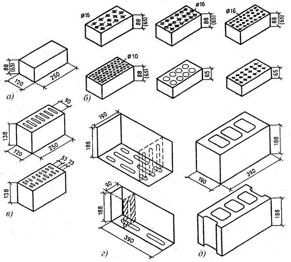 Рис. 4.21. Виды камней из искусственных материалов: а – кирпич сплошной; б – кирпич пустотный; в – керамические камни; г – легкобетонные камни с щелевыми пустотами (целый и половинный); д – то же с тремя пустотами