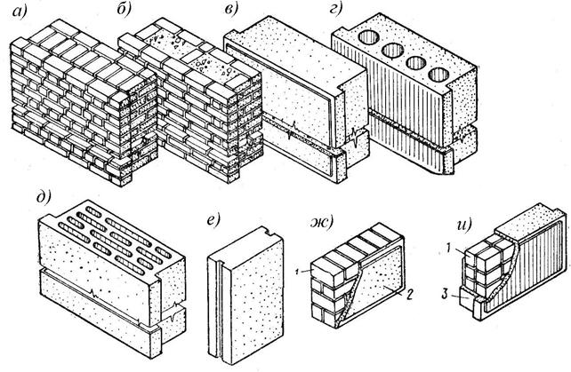 Рис. 4.15. Облегченные кирпичные стены: а, в – с заполнением из легкого бетона; б – с термовкладышами; г – колодцевая кладка; д – стена с воздушными прослойками; е – с утеплителем из теплоизоляционных плит; ж – то же, но на относе: 1 – воздушная прослойка; 2 – легкий бетон; 3 – теплоизоляционная плита