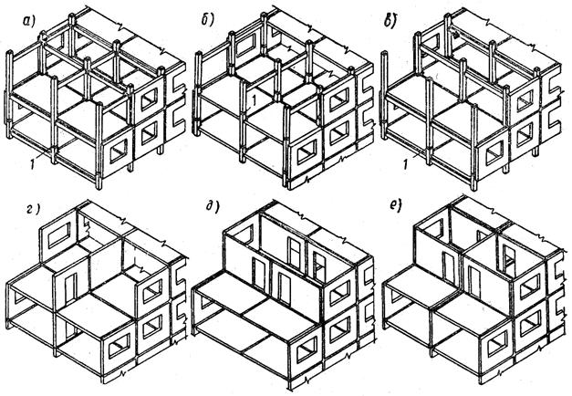 Рис. 4.25. Конструктивные схемы крупнопанельных зданий: а – с пространственным каркасом; б – с полным продольным каркасом; в – с поперечным каркасом; г – бескаркасное с несущими наружными и внутренними продольными стенами; д – то же с несущими поперечными стенами; е – то же с несущими наружными и внутренними продольными и поперечными стенами Каркасно-панельная система применяется в строительстве общественных (преимущественно) и промышленных зданий высотой от 1 до 30 этажей. В жилищном строительстве эта система применяется редко, так как значительно уступает панельной по показателям затрат труда, сроков строительства и расхода стали. Однако каркасная система обеспечивает гибкость планировочных решений при проектировании и относительно недорогую модернизацию и даже перепрофилирование зданий в процессе их эксплуатации. В каркасно-панельных домах каркас бывает пространственным, продольным или поперечным (рис. 4.25, а, б, в). Встречаются также каркасно-панельные здания с неполным внутренним каркасом и несущими наружными стенами. При укрупнении панелей перекрытий до размеров на комнату они могут выполнять несущую роль ригеля. Наружные стены в каркасно-панельных домах обычно ненесущие (навесные). Стеновые панели изготовляются аналогично крупным блокам в промышленных условиях. Однако в крупнопанельных стенах отсутствует перевязка швов, толщина их сравнительно невелика, поэтому для большей устойчивости панелей требуется надежное взаимное крепление. Среди различных схем членения стен на панели наибольшее распространение получили схемы с одноэтажными панелями размером с комнату (однорядная схема), высотой в этаж, протяженностью до 7, 2 м и массой до 10 т. Применяют также горизонтальные схемы с простеночными панелями на один или два этажа, междуоконными и угловыми вставками (вертикальная схема) и с поясными или полосовыми простеночными и угловыми панелями. При выборе схемы разрезки стремятся к минимальному числу типоразмеров панелей, минимальной протяженности швов и максимальному укрупнению панелей с целью наиболее полного использования грузоподъемности кранов. В зависимости от назначения и условий работы стеновые панели подразделяют на наружные, внутренние, вентиляционные, карнизные, цокольные и др. По своей конструкции панели бывают однослойные (из однородных материалов) и слоистые (рис. 4.26).
