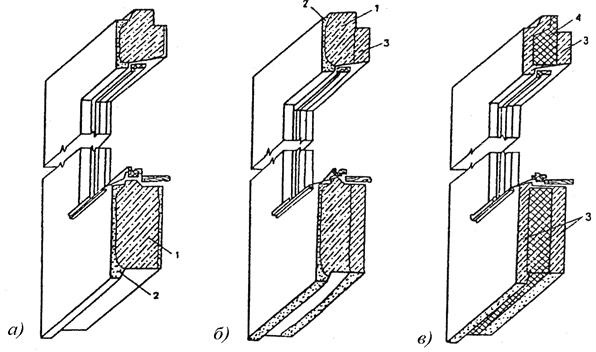 Рис. 4.26. Конструкции панелей наружных стен: а – однослойная; б – двухслойная; в – трехслойная: 1 – конструктивно-теплоизоляционный бетон; 2 – защитный отделочный слой; 3 – конструктивный бетон; 4 – утеплитель Благодаря простоте и низкой стоимости производства однослойные панели получили наибольшее распространение и используются для сооружения как внутренних, так и наружных стен. Чаще всего их изготовляют из керамзитобетона класса В5–10 с объемным весом 800–1400 кг/м3 или из автоклавного ячеистого бетона класса В3, 5–7, 5 с объемным весом 600–900 кг/м3. В двухслойных панелях применяют несущий (конструктивный) слой из железобетона, а второй слой – из теплоизоляционного легкого или ячеистого бетона. В трехслойных панелях в качестве утеплителя применяют жесткие или полужесткие маты и плиты из стекло- и минераловаты, полистирольного пенопласта, пеностекла, фибролита и др. Наружный слой выполняют из железобетона толщиной не менее 65 мм, а внутренний – не менее 100 мм. В последние годы в строительстве появились панели из небетонных материалов, которые применяют для сооружения легких стен. Такие стены проектируют с наружным (фасадным) слоем из металла, алюминиевых сплавов, стеклопластиков, закаленного стекла или асбестоцемента. Комплектацию облицовочных и утепляющих слоев в панель выполняют склеивая их между собой безусадочными клеями (изделия типа «сэндвич») либо путем крепления к внутреннему каркасу панели. Изделия типа «сэндвич» применяют преимущественно в малоэтажных общественных зданиях из легких металлических конструкций, а каркасные – в жилых и общественных зданиях средней и повышенной этажности. Для каркаса панелей обычно применяют сталь, алюминий или асбестоцемент. Эти теплопроводные материалы ухудшают теплотехнические свойства панелей, поэтому в отечественных климатических условиях наиболее пригодны деревянные каркасы. Внутреннюю обшивку выполняют из гипсокартона, гипсоопилочных и древесно-волокнистых плит. В таких панелях внешние листы изготовляются из асбестоцемента или полимеров (пластмасс). Внутреннее пространство заполняется минеральной ватой различного происхождения или изоляционными древесно-волокнистыми плитами в 2–3 слоя с воздушными прослойками. Используются такие панели в основном для ненесущих стен. По температурно-влажностному режиму, от которого в большей степени зависят долговечность и теплозащитные свойства ограждения, различные виды слоистых панелей неравноценны. С точки зрения теплоизоляции, наилучшими являются панели, у которых теплоизолирующий слой находится ближе к внешней поверхности стены. Однако помещать его снаружи нецелесообразно, так как материалы, применяемые для теплоизоляции, очень подвержены атмосферным воздействиям. Для вентиляции помещений крупнопанельных зданий, а также для отвода дыма от нагревательных приборов применяют специальные панели с дымовентиляционными каналами. Стыки панелей. Конструкции стыков панелей стен являются одной из важнейших деталей крупнопанельных зданий, так как стыки в таких зданиях нередко выполняют роль осадочных и температурных швов, при этом они должны быть герметичными, создавать надежную связь между сопрягаемыми элементами и обеспечивать в помещениях необходимый температурно-влажностный режим. В зависимости от направления сты