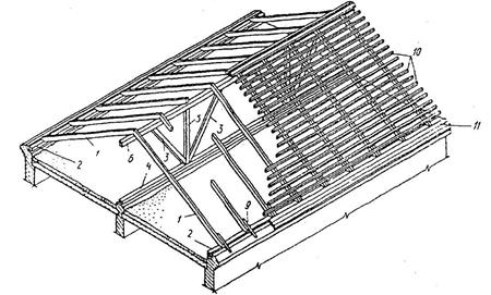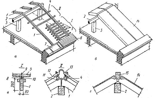 Рис. 4.39. Наслонные деревянные стропила скатной крыши: 1 – стропильная нога; 2 – мауэрлат (настенный брус); 3 – подкос; 4 – лежень; 5 – стойка; 6 – прогон; 7 – распорка; 8 – схватка; 9 – кобылка; 10 – обрешетка; 11 – свес крыши . Рис. 4.40. Сборные железобетонные крыши: а – с железобетонными стропильными ногами и обрешеткой; б – из железобетонных ребристых плит; в – детали обрешетки; г – опирание плит на прогон: 1 – стропильная нога; 2 – железобетонный прогон; 3 – кирпичный столбик; 4 – железобетонные бруски обрешетки; 5 – обрешетка; 6 – дощатый настил над карнизом; 7 – кобылки; 8 – выпуск арматуры диаметром 4–6 мм; 9 – гвозди; 10 – антисептированный брусок; 11 – кляммеры; 12 – волнистый асбестоцементный лист усиленного профиля; 13 – фасонный коньковый элемент кровли; 14 – ребристая железобетонная плита; 15 – коньковый элемент