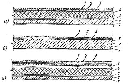 Рис. 4.45. Конструктивные схемы совмещенных крыш: а–г – невентилируемые с теплоизоляцией, отдельной от несущей конструкции крыши; б – то же с теплоизоляцией, являющейся одновременно несущей конструкцией; в – вентилируемые: 1 – защитный слой; 2 – рулонный ковер; 3 – цементно-песочная стяжка; 4 – теплоизоляция; 5 – пароизоляция; 6 – несущая конструкция (плита); 7 – отделочный слой; 8 – воздушная прослойка; 9 – теплоизоляционный несущий слой