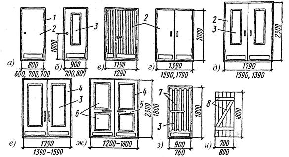 Рис. 4.51. Двери различных конструкций (размеры указаны в мм): а – щитовая однопольная; б – то же остекленная; в – то же полуторная (служебная); г – щитовая двупольная глухая; д – то же остекленная; е – обвязочная остекленная; ж – филенчатая; з – решетчатая служебная; и – плотничная на планках (для временных сооружений): 1 – дверная коробка; 2 – щитовое полотно; 3 – стекло; 4 – обвязка; 5 – средник; 6 – филенка; 7 – бруски решетки; 8 – планки