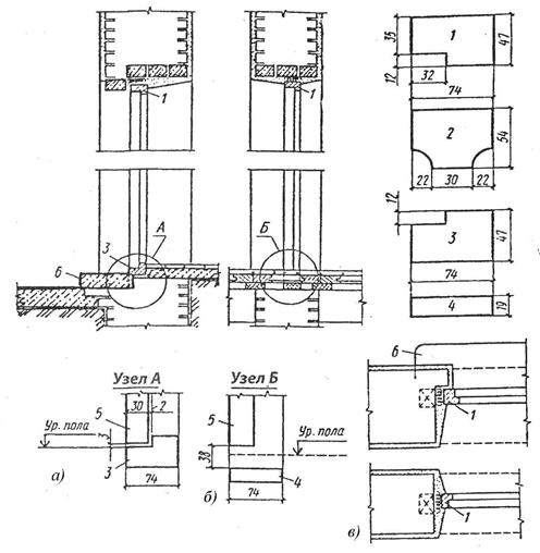 Рис. 4.52. Установка дверных коробок: а – в проемах каменных стен с четвертями; б – в проемах каменных стен без четвертей; в – сечение брусков: 1 – сечение верхнего бруска и косяков; 2 – то же для дверей с качающимися полотнами; 3 – нижний брусок (порог); 4 – монтажные доски (для коробок без порога); 5 – дверное полотно; 6 – входная ступень