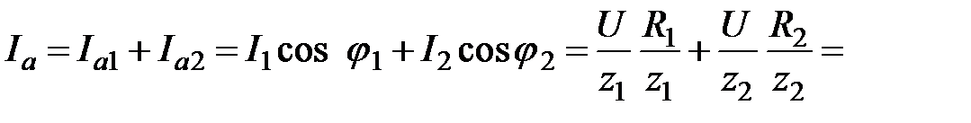 В качестве основного вектора принимаем вектор напряжения источника , являющегося общим для двух параллельных ветвей (рис. 2.13 б). Тогда относительно него нетрудно сориентировать векторы токов . При выборе направления тока второй ветви угол откладываем от вектора в направлении, параллельном вектору , поскольку начала этих векторов не совмещены. В соответствии с первым законом Кирхгофа ( ) определяем входной ток. В дальнейшем все расчетные соотношения получим из векторной диаграммы. Для этого представим каждый вектор проекциями на взаимноперпендикулярные оси. Проекцию вектора тока на вектор напряжения назовем активной составляющей тока , а перпендикулярную проекцию – реактивной составляющей . На диаграмме (рис. 2.13 б) эти составляющие показаны для всех векторов. Составляющие токи и физически не существуют и должны рассматриваться только как расчетные. По диаграмме активная составляющая входного тока определяется как сумма активных составляющих токов в параллельных ветвях