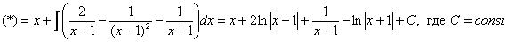 (1) Здесь неправильная дробь, поскольку старшие степени числителя и знаменателя равны: 3 = 3. Для того чтобы разделить числитель на знаменатель придётся временно раскрыть скобки в знаменателе. (2)-(3) Теперь можно разделить (4) От первого слагаемого сразу берем интеграл. Знаменатель оставшейся, уже правильной, дроби снова записываем в виде произведения множителей. Тут я немного подсократил разложение, надеюсь, всем понятно, что Далее накатанная колея… Методом неопределенных коэффициентов разложим подынтегральную функцию в сумму элементарных дробей: