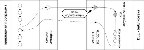 Однако если в момент установки троянской программы имеется возможность модифицировать либо код программы, либо саму библиотеку, то последовательность вызова процедуры будет уже другой – с активацией несанкционированного кода троянской программы. Пример, демонстрирующий вариант с изменением прикладной программы показан на рис.3.2.2, с изменением DLL-библиотеки – на рис.3.2.3.
