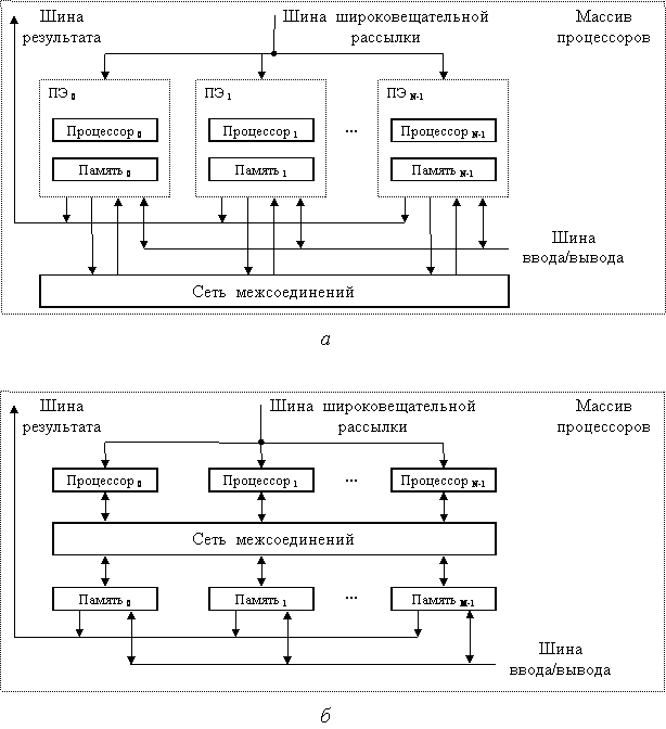 Рис. 8.3. Модели массивов процессоров: а – «процессорный элемент-процессорный элемент»; б – «процессор-память»