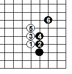 Ход в пункт 3-4, в котором находится черный камень на Д.1, с давних пор является наиболее популярным началом игры в углу. Так расположенный камень, подобно камню, расположенному в точке 3-3, защищает угол, хотя и облегчает противнику давление с одной из сторон. Если белые станут атаковать камень черных ходом 1 на Д.2., прямолинейно копируя идею дзёсэки из части 1, черные будут более чем счастливы ответить серией ходов 2, 4,, дающих им прекрасный результат. Вместо того чтобы дарить черным такой большой угол, белые, обычно, атакуют черный камень одним из ходов, показанных на диаграммах 3-6. Если мы считаем черный камень, находящийся на третьей линии, то ход белых 1 на Д.3 является естественным путем для атаки. Замысел белых состоит в создании позиции на правой стороне или центре, в то время как черные получают угловую территорию. Все дзёсэки в этой главе иллюстрируют эту идею, причем, большинство из них начинается ходом 1 на Д.3.