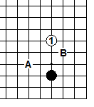 Если же мы считаем, что чёрный камень находится на четвертой линии, то естественным становится ход белых 1 на Д.4., грозящий вторжением в точку А. В большинстве дзёсэки, начинающихся таким образом, чёрные отвечают сжимающей игрой на правой стороне; такие дзёсэки рассматриваются в главе 3.
