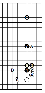белые могли бы применить указанную серию ходов даже в ситуации после хода 6 на Д.5, но тогда у чёрных уже не будет камня А, прижатого к борту, и чёрные получают удовлетворительную позицию.