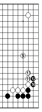 Д.5. белые должны проявить осторожность, не играя 9 слишком близко к нижнему правому углу. Если они все же так поступят, то чёрные оттеснят их ходами 10 и 12. После этого становится совершенно очевидно, что белые посредством хода 9 получают слишком малую территорию, к тому же слишком открытую сверху.