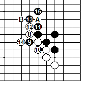 Д.3. Вместо 8 на Д.2., белые могут играть двойное ханэ, показанное здесь. В указанной серии ходов возможны другие варианты, например, 13 в A чтобы получить сэнтэ и 15 в В. белые получают более высокую стенку, но чёрные также усиливаются, к тому же они смогут сыграть 9, чтобы использовать этот камень позднее.