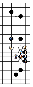 Д.3. Или они могут напасть снаружи, извлекая выгоду в центре. Серия ходов 1-7 на этой диаграмме особенно выгодна, если у чёрных уже имеется распространение вроде камня A на краю доски.