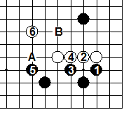 Д.17. Если после основного дзёсэки черные решают атаковать оба камня белых, они обычно сначала ходом 1 блокируют угол от вторжения в него белых, а затем продолжают 3 и 5. Ход белых 6 дает им хорошее построение, хотя это и кажется несколько странным. У белых для дальнейшей игры имеется два приемлемых пункта A и B. Поэтому, если черные займут один из них, то белые сыграют в другой.