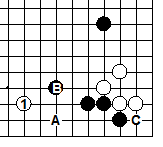 Д.2. После хода черных B на четвертую линию белые могут атаковать 1, имея целью проникнуть снизу в A. Если им удастся сыграть A или C в придачу к ходу 1, то группа черных станет слишком стесненной для построения глаз.