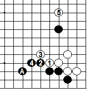 Д.3. Если черные сделают ход A внизу, то белые не могут атаковать столь удачно внизу. Однако, они могут играть кикаси в 1 и 3, а потом атаковать в 5. Играя A, черные должны выбирать защиту одной из сторон.