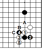 Д.10. Интересно, что ход белых 3 на этой диаграмме приводит к ужесточению борьбы в углу. черные должны разрезать ходом 4 и после хода белых 5 они испытывают затруднения. Далее черные должны играть A, наиболее острого из трех, но справа…