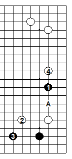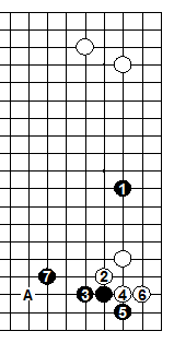 Д.2. Если позиция белых не позволяет атаковать, они могут получить хорошую территорию, играя последовательность 2-7. Ход черных 7 может быть также в A. Например, если в верхнем правом углу стоит симари черных, белые конечно выберут путь развития как на Д.1.