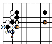 Д.3. В первом из них белые играют атари в 7 и черные строят свою стену в сэнтэ с помощью 8, 10, 12. белые же охотно закроют ко в 13, и тогда черные могут играть 14, A или где-то еще снаружи.