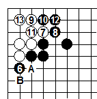 Д.12. Далее черные играют 6, а белые выживают в углу, имея в качестве потенциальной угрозы либо разрезание в A, либо сжимающее цуке в B.