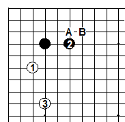 Д.3. Другой пример использования хода 3 из Основного дзёсэки. Точка A, находящаяся посередине между пунктами 1 и A, кажется более предпочтительной, нежели 3, однако, в этом случае черным была бы предоставлена возможность для вторжения между белыми камнями 1 и A. Если же черные вторгнутся между камнями 3 и B, то снизу имеется сильное построение белых из двух камней.