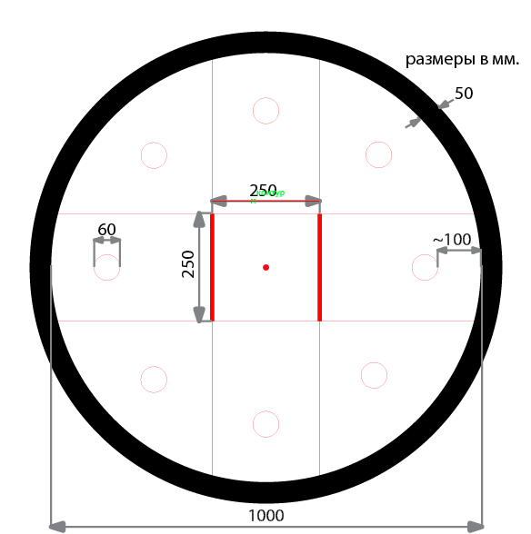 Поле 2.1. Белый круг диаметром 1 м с чёрной границей толщиной в 5 см. 2.2. Красной точкой отмечен центр круга. 2.3. Поле может быть в виде подиума высотой 10–20 мм.