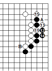 Д.2. Цель ходов 13 и 15 взять белым прибыль в углу. Далее, черные должны защищаться в A, но сначала им следует воспользоваться случаем для создания кикаси ходом в A.