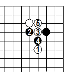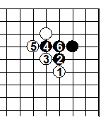 Д.6. Забавно, однако, что черные отделяют два белых камня также посредством цукэ. Стандартный ответ белых – 3. После хода белых 5 черные могут соединиться с черным камнем 4 с одной стороны, а белые разрежут с другой.