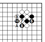 Д.8. Когда черные соединяются изнутри, а белые отрезают в 7, простейшее продолжение рекомендует черным жертвовать камень и играть 8 и 10. это очень острое продолжение, т.к. белые ходом 11 в A могут завязать ко-борьбу, но идти на неё можно, лишь имея превосходство в ко-угрозах.